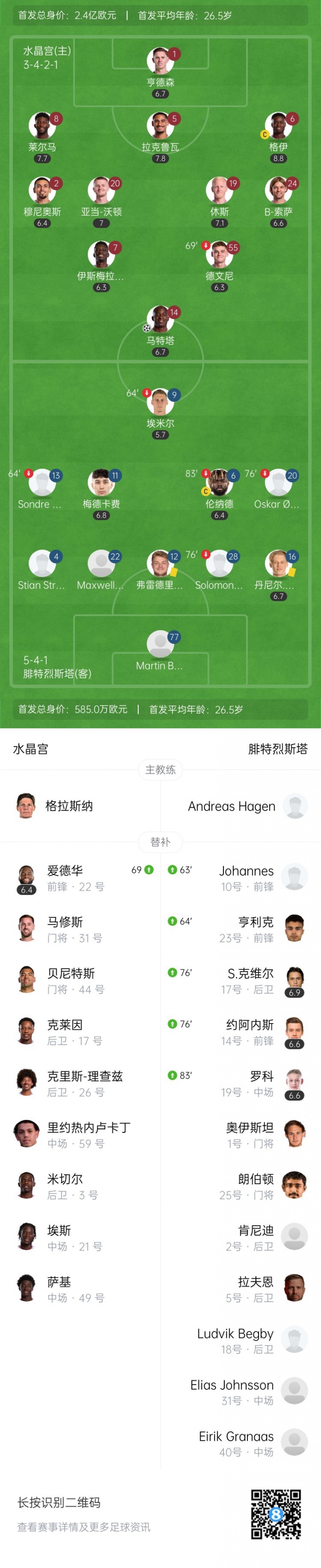 8月22日消息,欧协联资格赛首回合较量中,水晶宫以1-0险胜挪威球队腓特烈斯塔,格伊佩戴队长袖标首发,而埃泽未登场。赛后,主帅格拉斯纳公开表达了对球队阵容深度的担忧,明确表示不会在次回合前放行格伊。